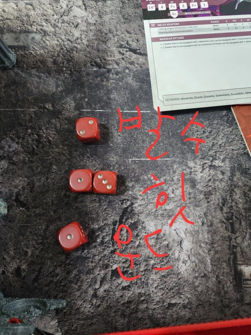 즉, 시커 3기 / 노이즈 마린 4명 / 키퍼 오브 시크릿의 3개 유닛으로 전황을 뒤집어야만 합니다.